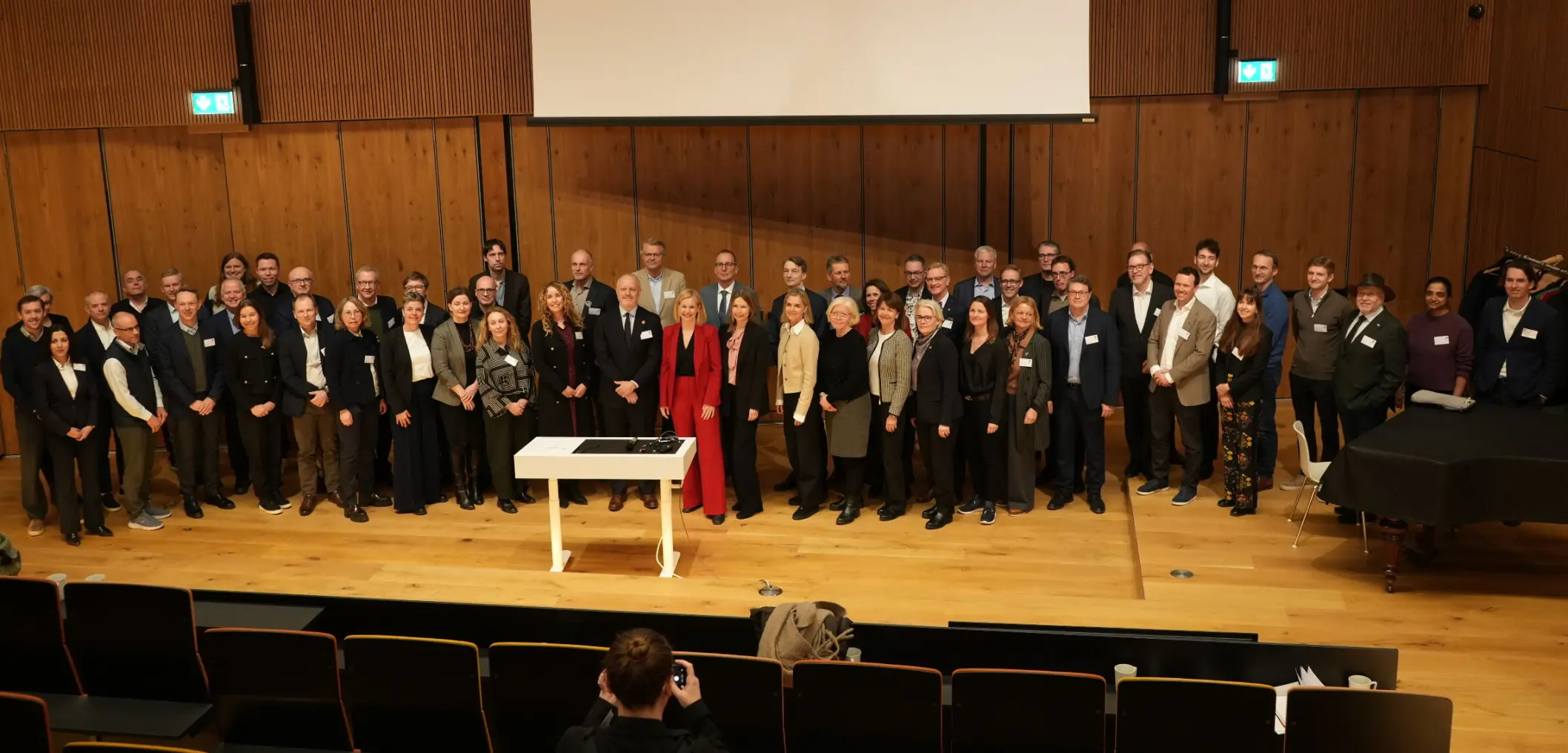 Rekordstor delegasjon fra næringslivet, akademia og politikken til København for å lære om kvantesatsing. Her er delegasjonen samlet etter innholdsrikt program ved Niels Bohr-instituttet. Foto: Kristin Jonassen Nordby / Khrono